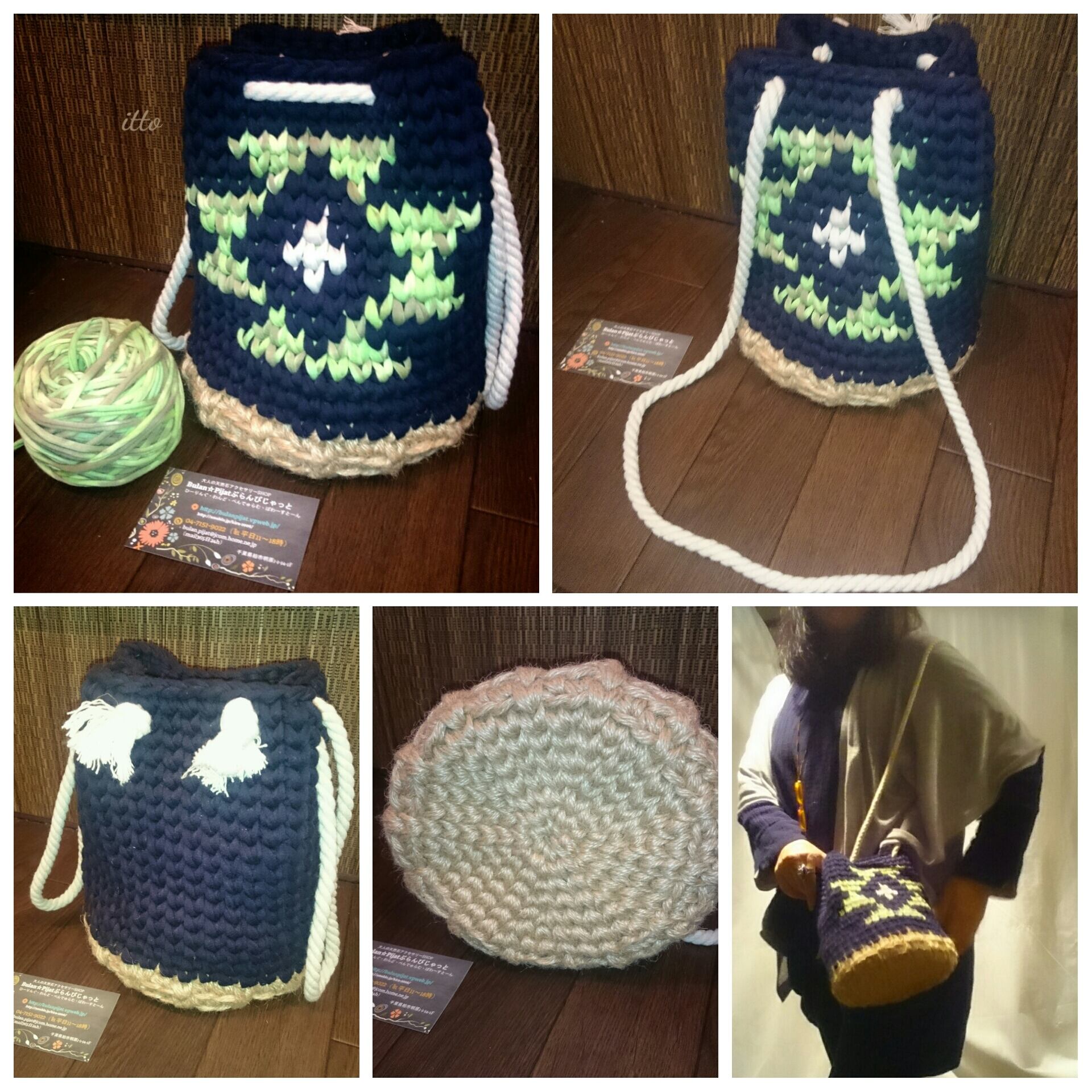 軽いイットヤーン ネイビーベースで、自社で染めたオリジナル染め糸で柄編みした巾着バッグです
