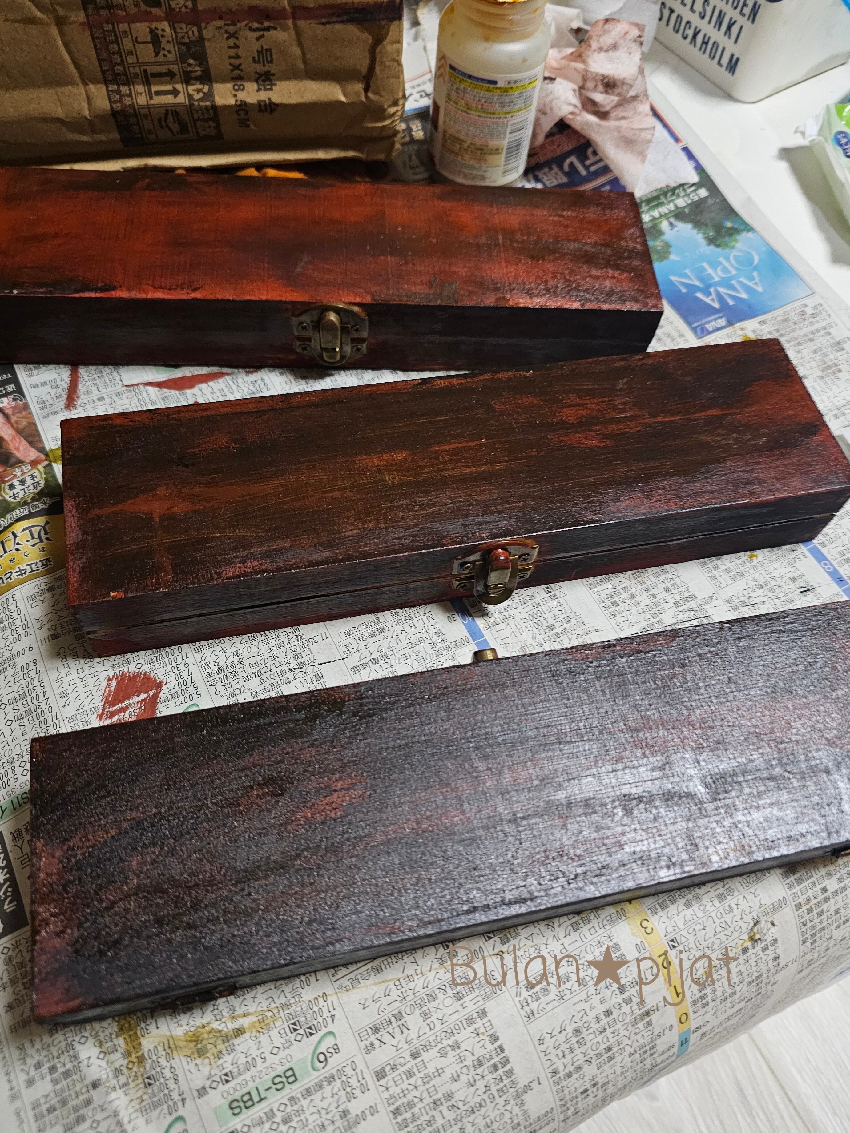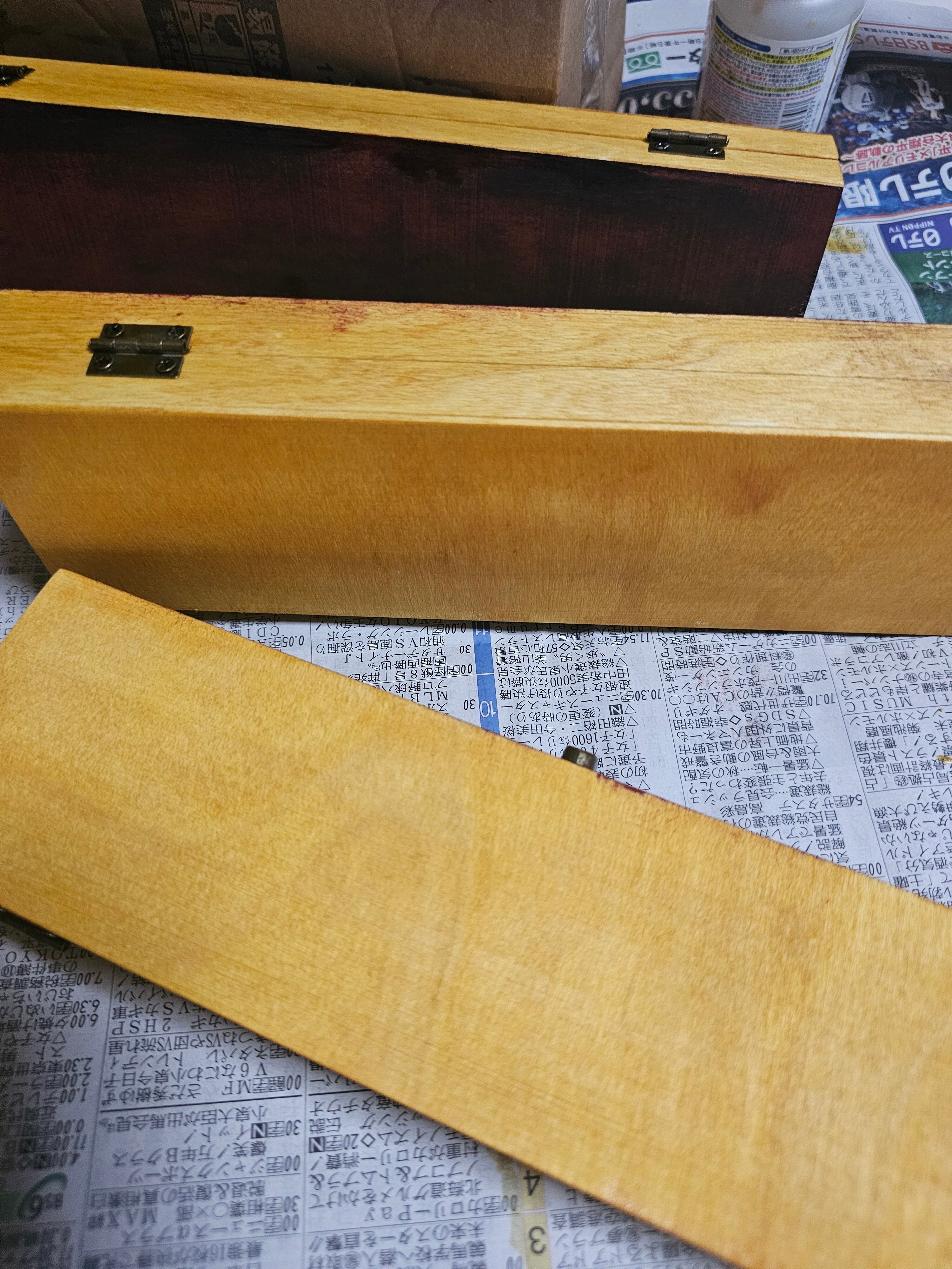 レトロ木箱にするために…アクリル絵の具とニスをぬってあります