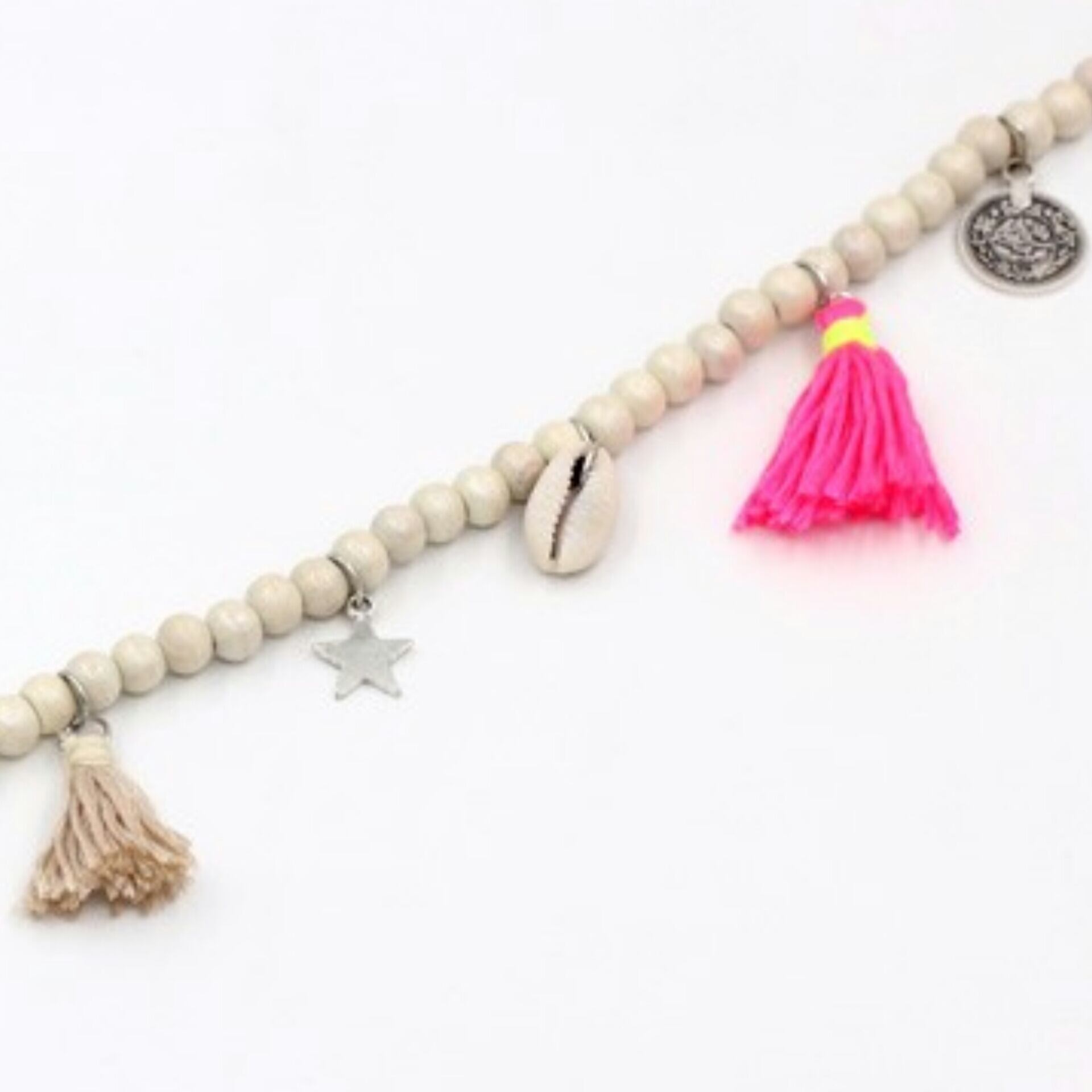 ホワイト ウッドビーズのネオンネックレス タカラガイ コイン
