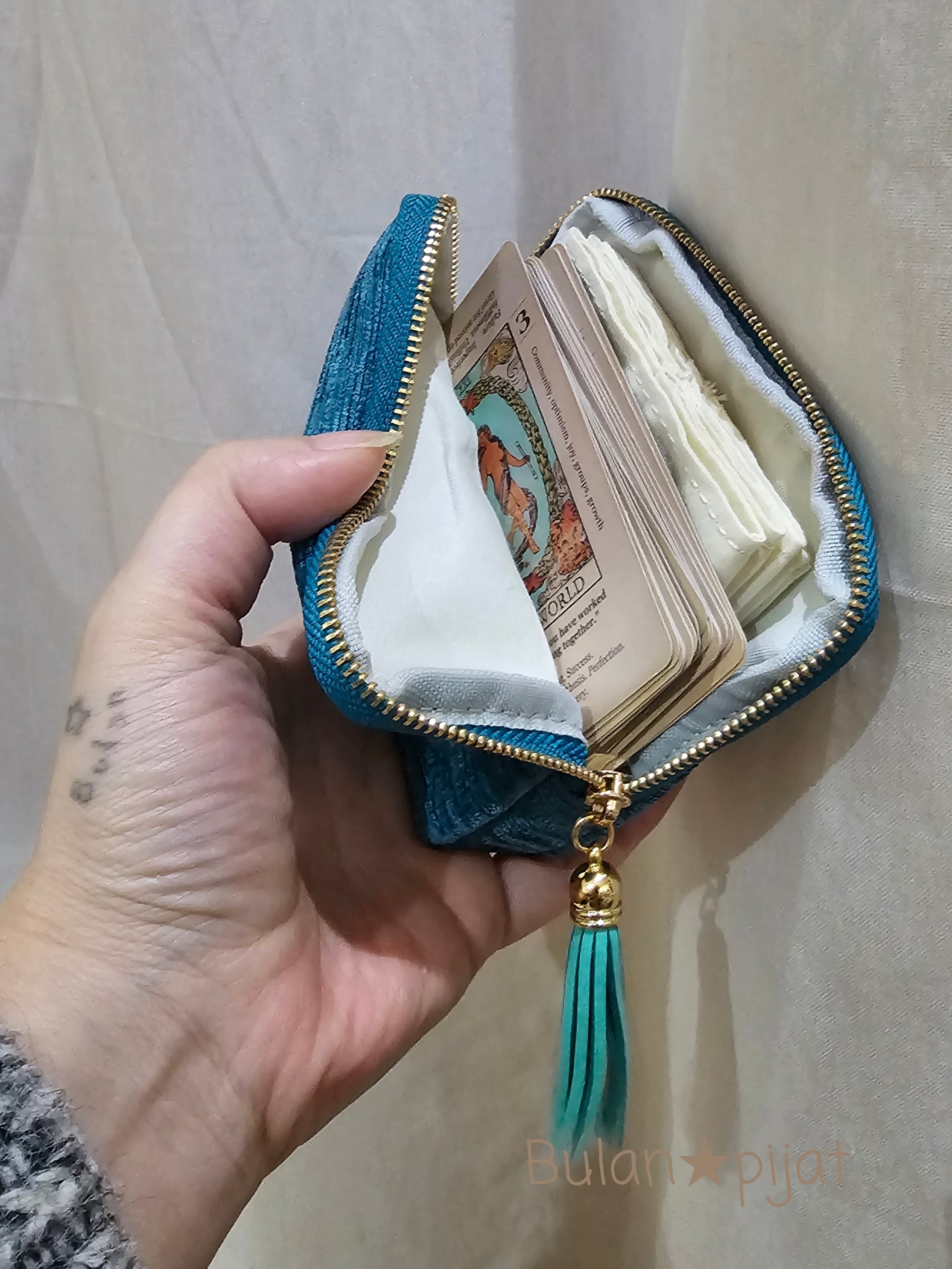 このポーチは、タロットカード、オラクルカードだけでなく、小物やアクセサリー、時計、リップ、タバコも収納可能。