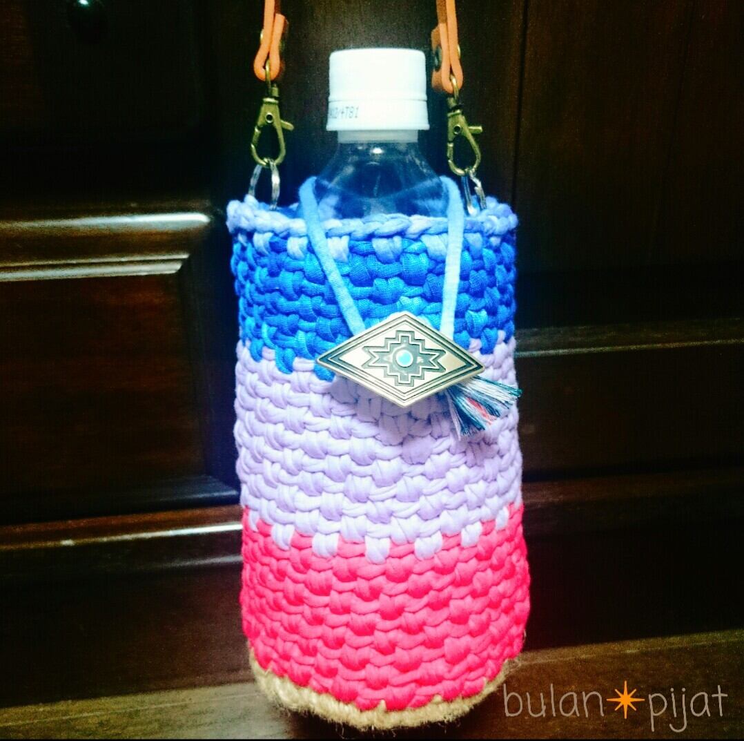 オーダーバッグの余りの余り糸でつぎはぎして編みましたペットボトルホルダーです
