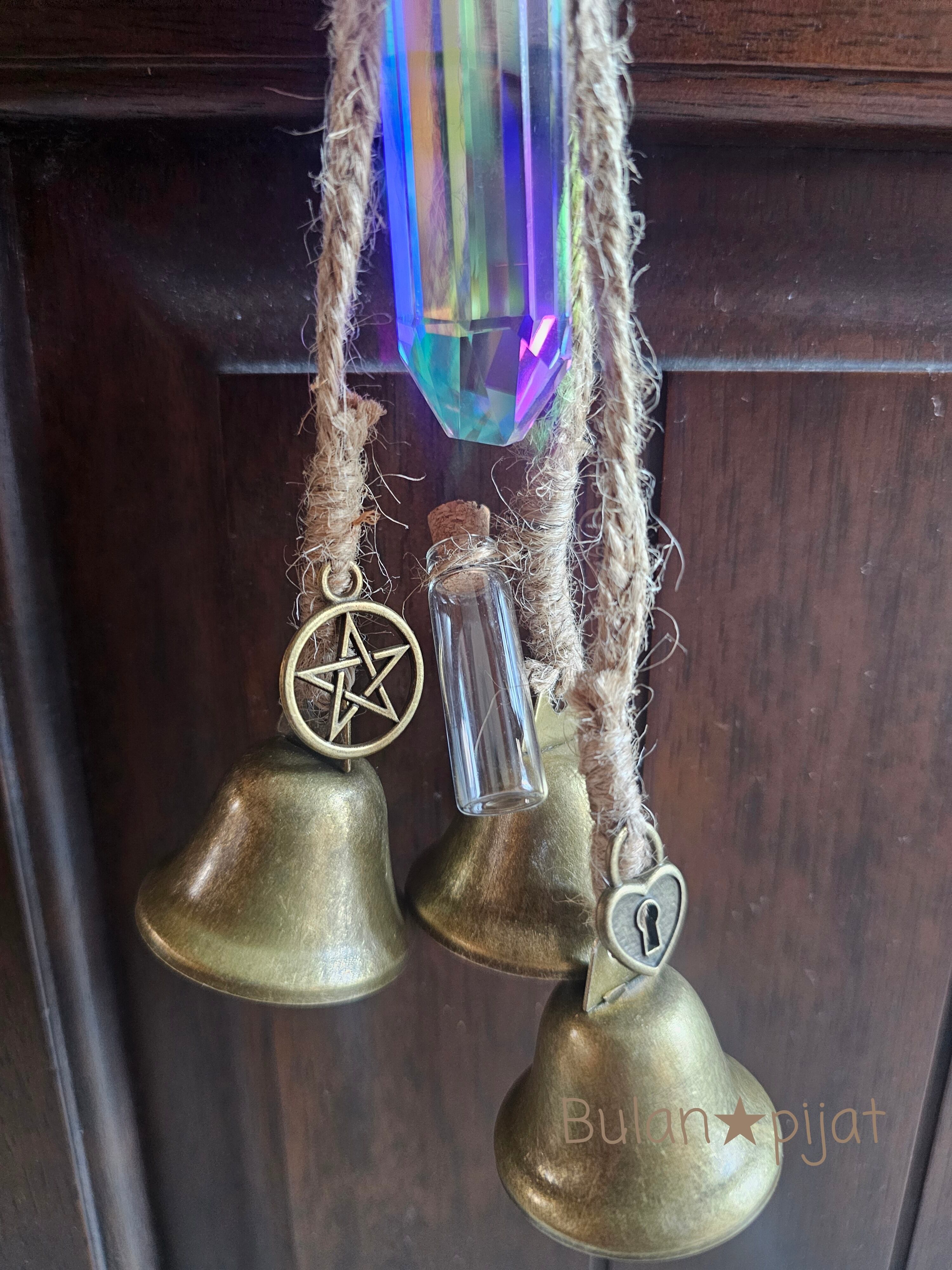 ## レトロなドアチャイム 魔女の魔よけの鈴に南京錠パーツ、小瓶、守りの五芒星パーツを着けました