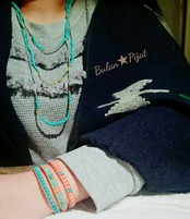 ラピスラズリとコーラルピンク珊瑚とビーズの2連になるよう3重にとめられるブレスレット