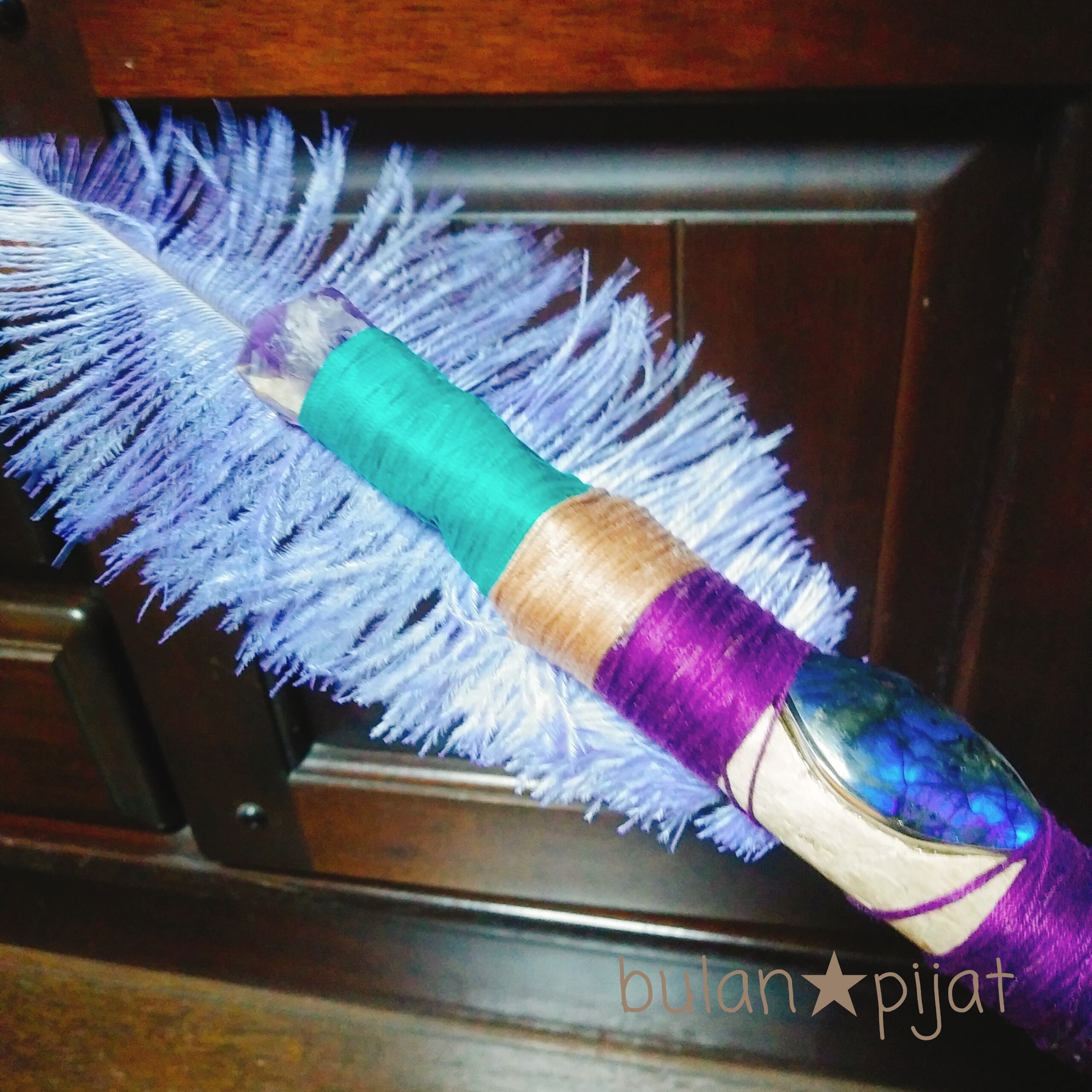 山と川のエネルギーを浴びた流木を使い先端にはアメジスト真ん中にはラブラドライトをはめ込み糸を巻きました