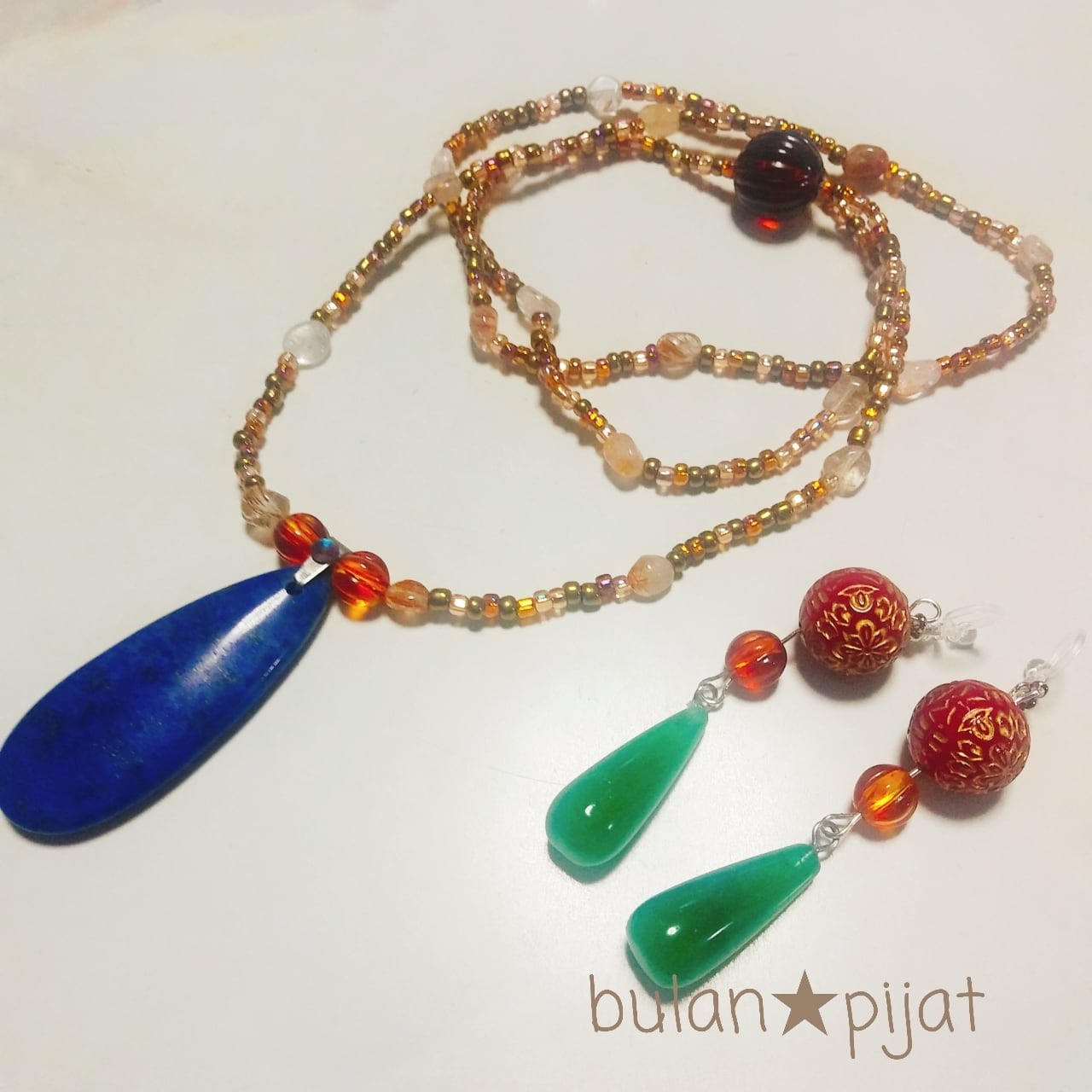 ラピスラズリのルチルクォーツとビーズネックレス グリーンアゲートイヤリングセット ハウルアクセサリー ハウルの動く城