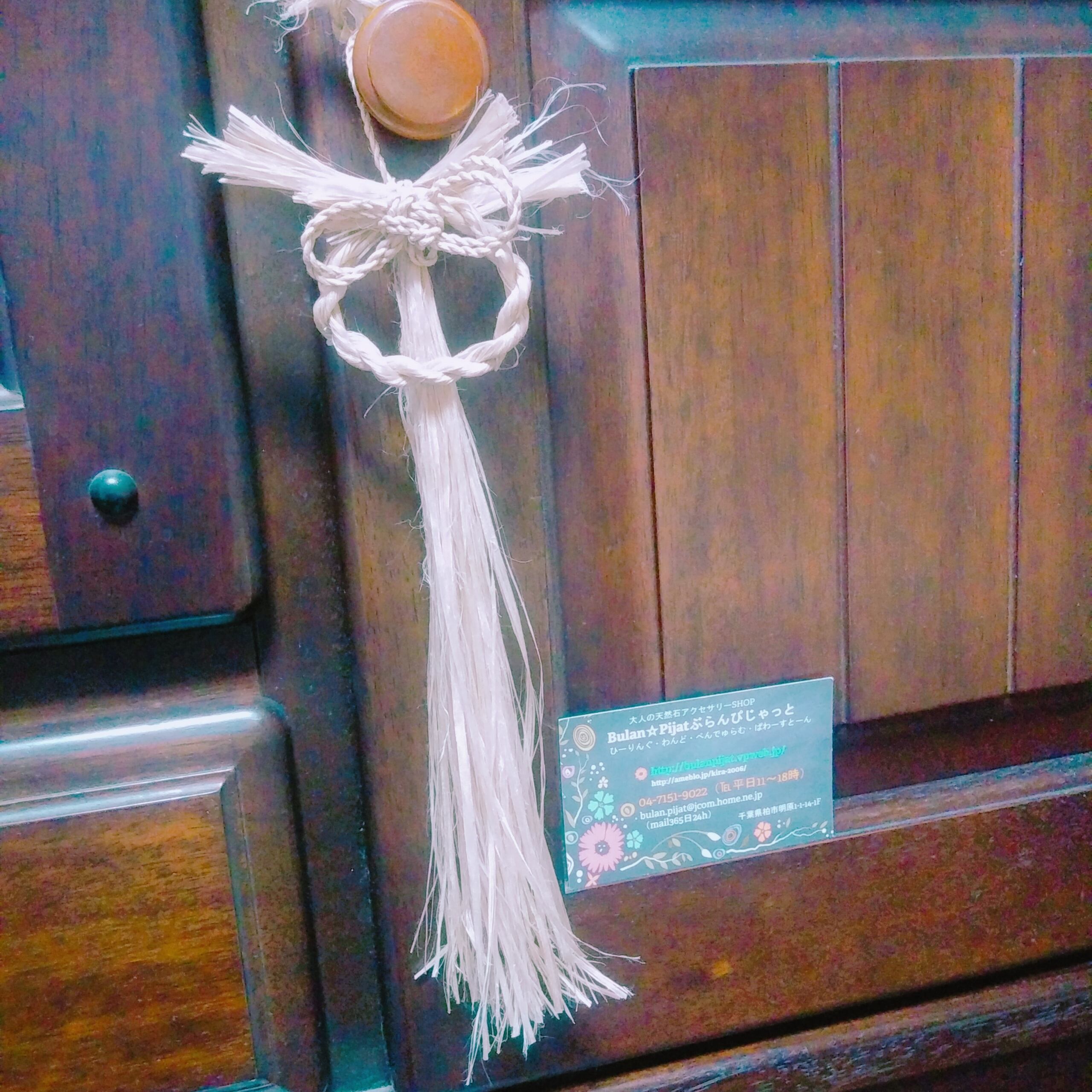 人気の名刺サイズのミニ精麻しめ縄に、精麻タッセル飾りを付けたものです