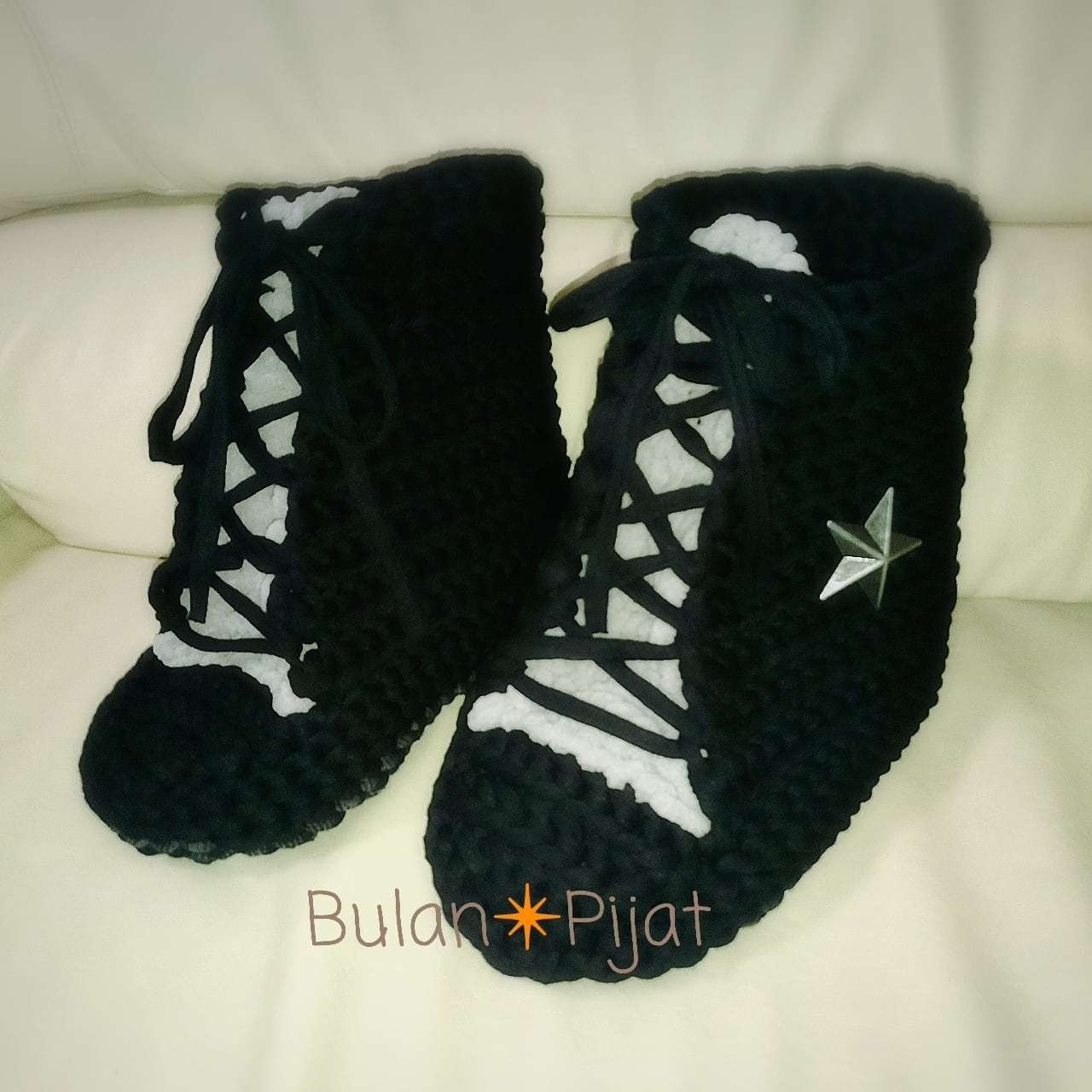 黒いhoookedzpagetti【ズパゲッティ】を丸々1巻使用、底部分にはダークグレーヤーンを使用した贅沢手編みルームシューズならぬルームシューズです