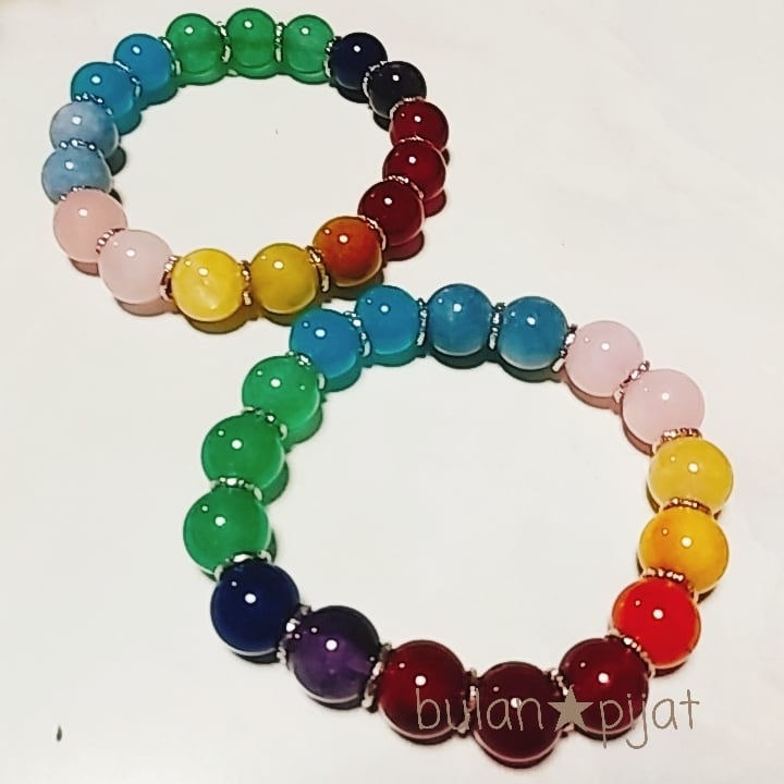 アイスアマゾナイト、ローズクォーツ、アメジスト、カルサイト、アゲート、シルバーリングで爽やかイメージレインボーカラーの天然石ブレスレットです