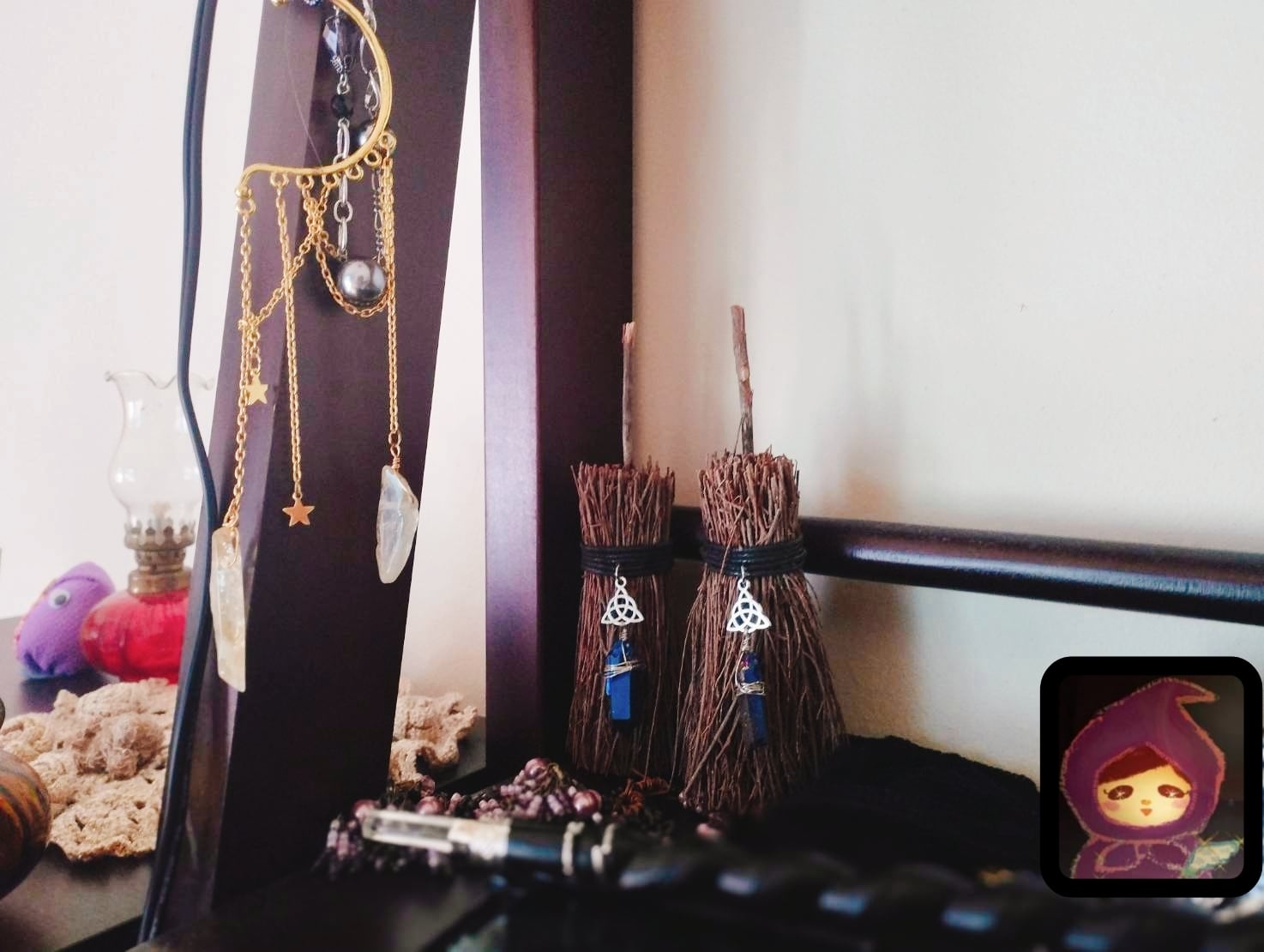 17cmコキア ほうき飾りネックレス魔女集会 魔女用ミニリース クリスタルオーラクォーツケルト文様の三位一体トリケトラ