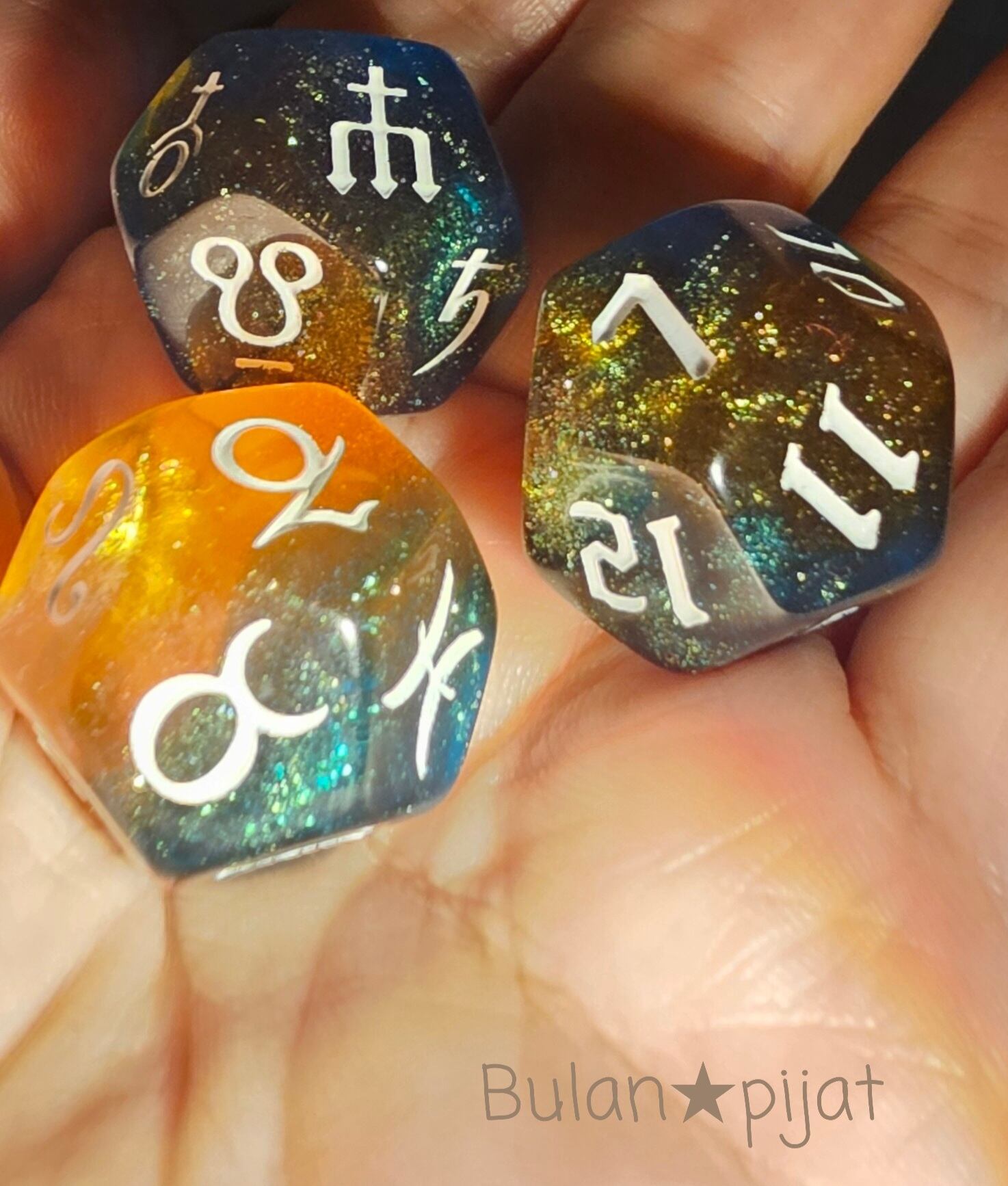 三つのサイコロにはそれぞれ、西洋占星術の「天体、サイン(星座)、ハウス」が描かれています。