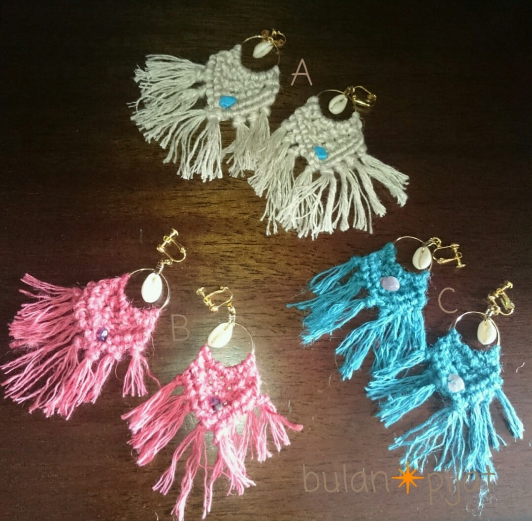 マクラメ編みに天然石さざれ石を挟め、リング中央には貝殻をつけたイヤリング/ピアスのペアです